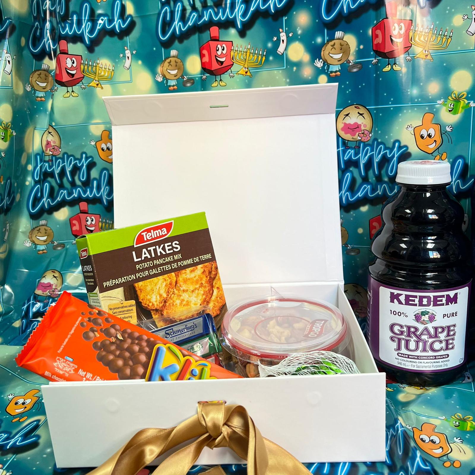 Add some joy to someone’s Chanukah with our adorable “Chanukah Nosh Box.” It’s full with delicious snacks which makes it an excellent gift for loved ones.